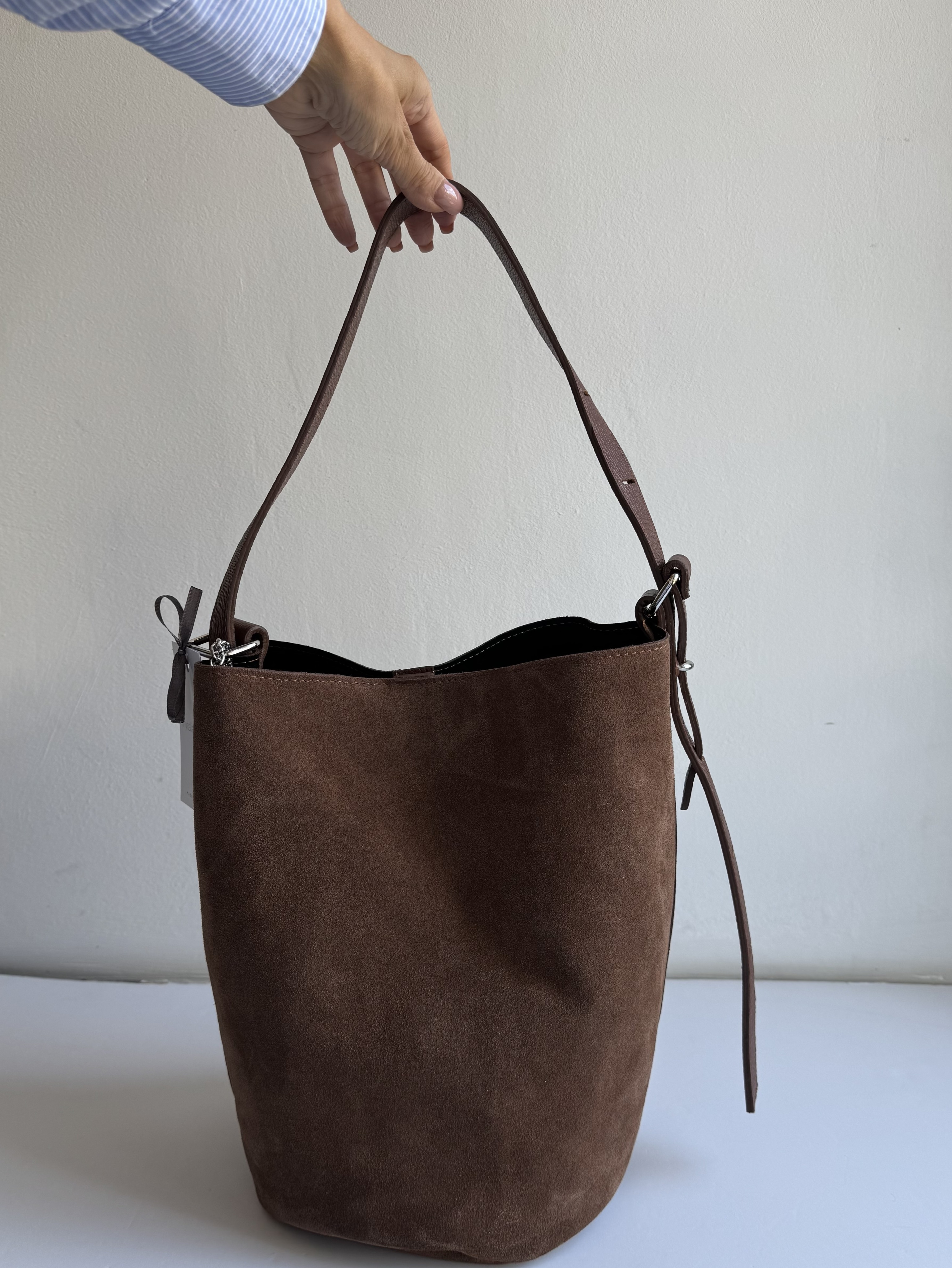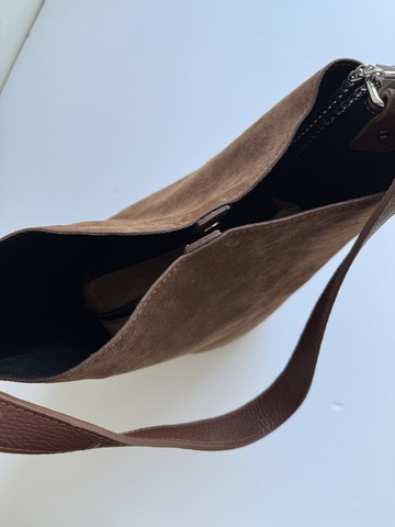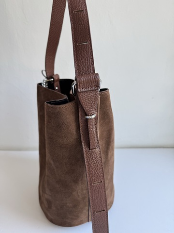 Выполнена из натуральной замши. Ремень из натуральной зернистой кожи. Внутри одно отделение, самостоятельная косметичка. Закрывается на кнопку.