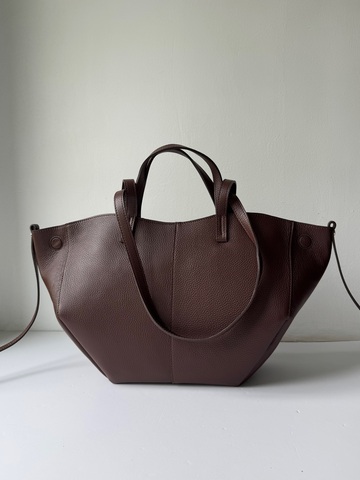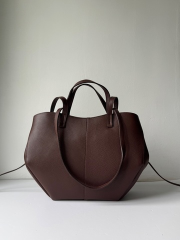 Выполнена из натуральной зернистой кожи, 2 пары вшитых ручек. Внутри самостоятельная косметичка, одно главное отделение, без дополнительных карманов. Закрывается на молнию. На верхних углах расположены 2 дополнительные кнопки, которые позволяют трансформировать сумочку в меньший размер.